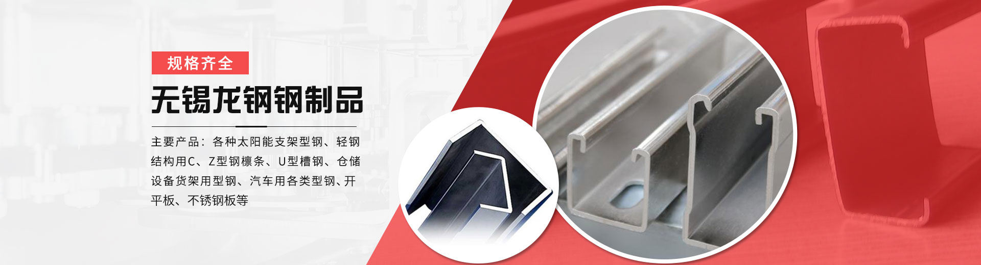 無(wú)錫市龍鋼鋼制品有限公司位于風(fēng)景秀麗的太湖之濱---無(wú)錫前洲鎮(zhèn),緊依滬寧高速玉祁出口,前洲工業(yè)園,交通十分便利,地理位置優(yōu)越。本公司是生產(chǎn)各種冷彎型鋼的專(zhuān)業(yè)廠(chǎng)家,公司擁有雄厚的技術(shù)力量,優(yōu)越的生產(chǎn)設(shè)備,良好的生產(chǎn)工藝,完善的質(zhì)量保障體系。主要產(chǎn)品:各種太陽(yáng)能支架型鋼、輕鋼結(jié)構(gòu)用C、Z型鋼檁條、U型槽鋼、倉(cāng)儲(chǔ)設(shè)備貨架用型鋼、汽車(chē)用各類(lèi)型鋼、懸掛鏈輸送機(jī)導(dǎo)軌、公路護(hù)攔板及各種非標(biāo)冷彎型鋼和各類(lèi)高頻焊管。無(wú)錫龍鋼愿與您攜手共進(jìn),走向未來(lái)、共創(chuàng)輝煌。